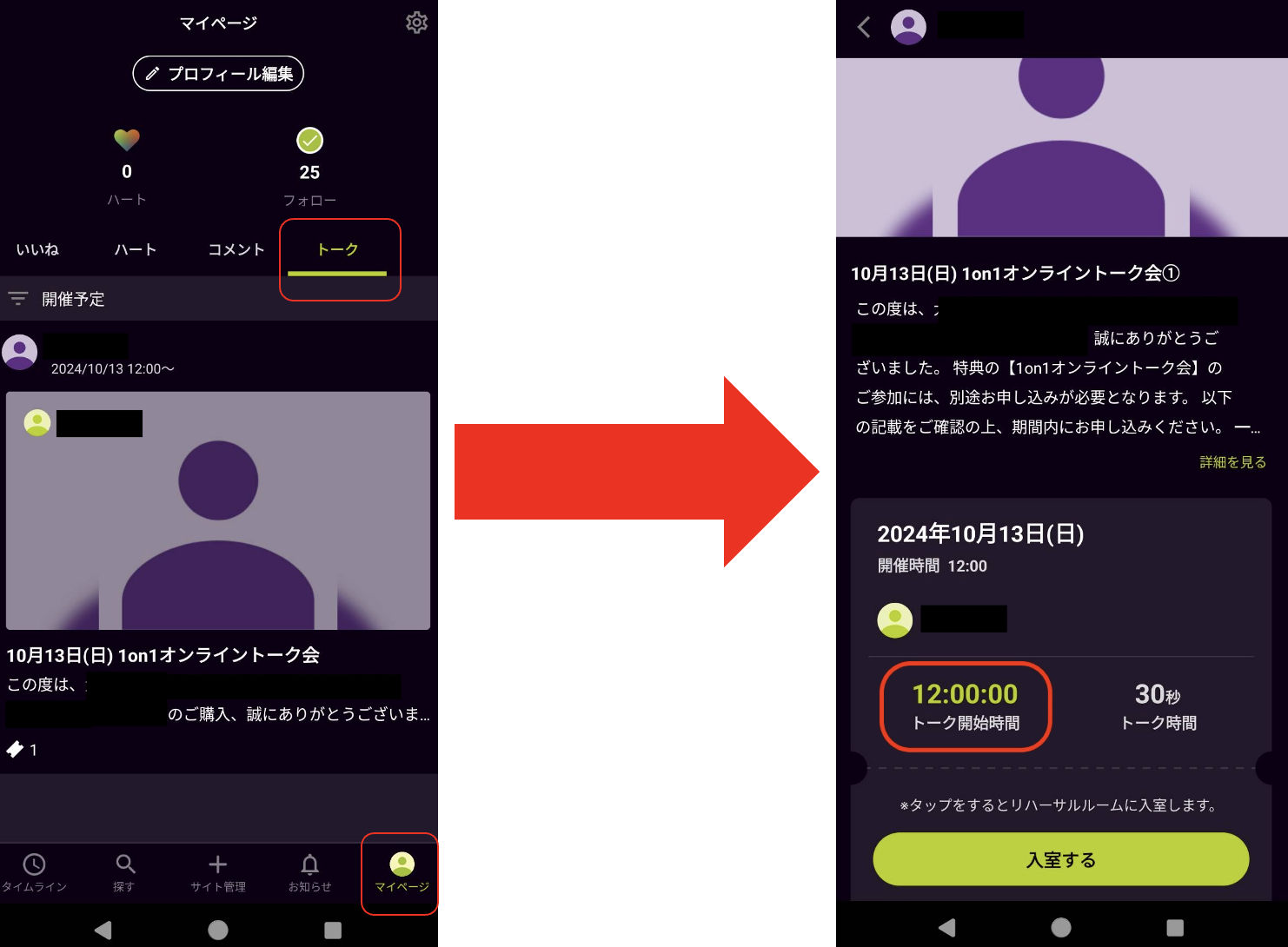 マイページ右側にある「トーク」のタブを開き、該当のビデオトークチケットをクリック、トーク開始時間の確認をお願いいたします。